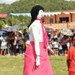 A group of people in colorful traditional attire gather outdoors, some dancing and others playing drums and singing, possibly celebrating New Year’s in Belize.