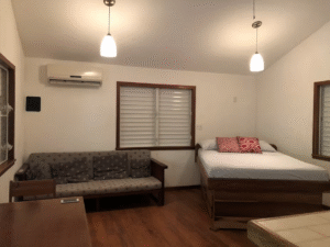 Lockwood Rental is a private cabana in Maya Beach on the Placencia Peninsula, just 20 minutes from Placencia Village, Belize. Tucked off the main road in a quiet neighborhood, this one room vacation rental sits on a large wooded lot beneath mature trees and backs onto a peaceful canal.