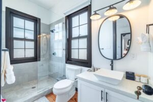 The villa offers five spacious bedrooms and four full bathrooms. On the first floor, three bedrooms each have a queen bed and a private bathroom, while the second floor, accessible via a staircase, features two bedrooms with two double beds each and a shared full bathroom—perfect for families or groups seeking comfort and privacy.
