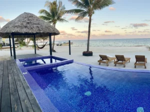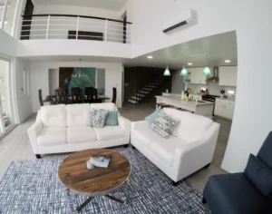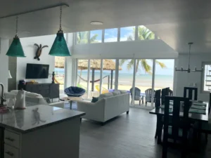Third Coast Belize Vacation Home is a beachfront rental property located 4.1 miles North of San Pedro, Belize. The Belize Barrier Reef is literally in our backyard, visible from the infinity pool, all balconies and the rooftop terrace, where you can best catch the sunset on the west side of Ambergris Caye. This house has a large kitchen and living room as well as a game room with a pool table and dart board. The property includes 100 feet of beach, private pool, hot tub, palapa, hammocks, kayaks, bikes, snorkels, fishing gear & more. Plenty of space for families and groups! Sleeping arrangements include 2 king beds, 5 queen beds and one sleeper sofa. The first floor features a large open concept living room, dining room, kitchen, and game room with a pool table and dart board. Upstairs has two co-master bedrooms and a bunk room. One bedroom is a first floor private apartment with its own entrance. Caretaker, cook, and cleaning staff on-site so you can enjoy a stress free vacation. We are located 4 miles north of town’s hustle and bustle, but there are several restaurants and bars within a couple of miles of this property. Secret Beach is 15 minutes West by golf cart and San Pedro Town is 15 minutes South. Third Coast Belize is a Tourism Gold Standard Certified Hotel.